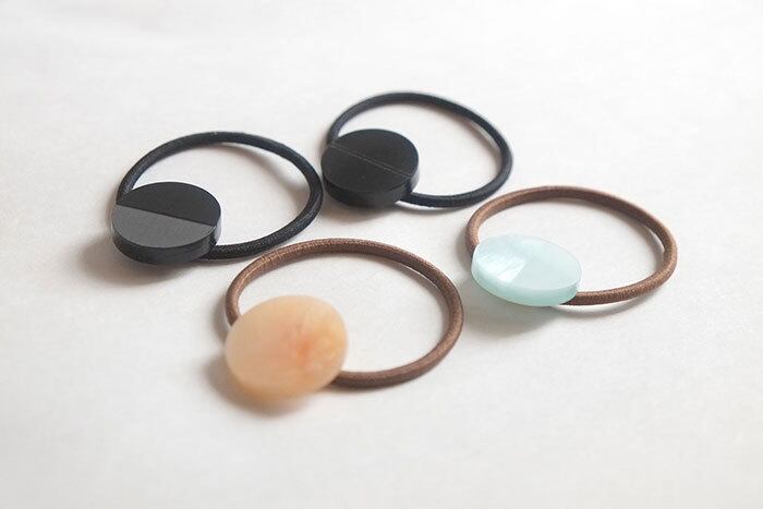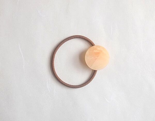 丸い飾りのついたヘアゴム。アクリルに彫刻された、さりげないデザインがほどこされています。シンプルなデザインのため、どんなファッションにも合います。